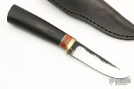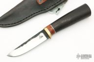 This Custom Hunter by Murad Custom Knives features a hand rub satin finished blade with forge finished flats, .233" blade stock and .872" blade depth, hidden tang construction. The handle has a brass guard with a rosewood grip with stainless steel and amboyna burl spacers. Comes with a black leather sheath and COA. New from maker.
