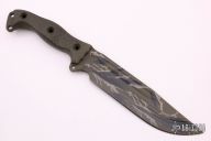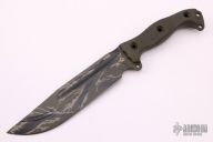 This Nuclear Forsaken Steel Heart by Busse features a woodland camo coated clip point blade with corrugated bevel technology and fullers, .213" blade stock and 1.799" blade depth, full tang construction. The handle has green G-10 scales, extended tang with lanyard hole. New from maker.