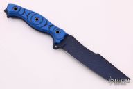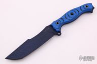 This P&L Statement by Busse features a blue coated clip point blade with .234" blade stock and 1.429" blade depth, full tang construction. The handle has black/blue G-10 scales with a lanyard hole at the butt. New from maker.