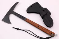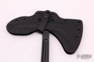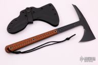 The Kestrel Feather is a lightweight and more compact version of the venerable 18" Eagle Talon. This multi-roll tomahawk was designed to be fast and light, it comes in at just 19oz, and 13.25" long. It offers full tang construction made from 1/4" 80CRV2 carbon steel that has a black Cerekote finish for corrosion resistance and wear. This is a heavy use tool, the full tang construction absorbs the punishment while the hardened striking surface on the head delivers it back without chipping or shattering. The permanently attached G10 handle scales offer a contoured 3D texture that works great both wet and dry without being overly aggressive. The 3 inch forward edge is razor sharp and that is combined with a 3" distal tapered spike that can be used for digging, shattering tempered glass, penetrating sheet metal, it can be used to hack through concrete and wood, to breaking chains and hardened padlocks. One tool, many tasks is the idea behind our tomahawks, We want you to never leave home without being prepared, whether that's an emergency situation or exploring the next vista to watch a killer sunset. The Kestrel Feather tomahawk is a very capable, lightweight hiking and camping tool. From chopping wood, to camp site clearing, food preparation, the tomahawk is an incredible cutting tool for a lot of tasks. It is also an important piece of kit for first responder's that require a tool for breach and extraction work. The 13.25" length won't impede movement yet can make quick work of anything that it comes in contact with! Comes with original trail pack, kydex sheath and papers. Excellent condition.