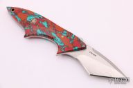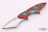 This DogTag by Jerry Hossom features nicely shaped turquoise scales with red liners and brass and mosaic pins. Hand rubbed satin finished blade with notched thumbrest, .158" blade stock and 1.337" blade depth, full tapered tang construction. Fits nicely in hand. Includes a zippered case. New from maker.