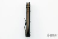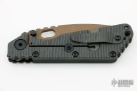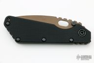 This SMF by Strider Knives features a bead blasted copper beryllium blade and textured black G-10 and flamed titanium handle and matching tip up titanium clip. Notches on thumbrest, rear of handle, and early lockup. Includes Hinderer "Lock Bar Stabilizer" for maximum reverse lock retention. This knife was originally designed as an EOD knife (except there is a stainless steel pivot, so it isn't completely non-magnetic). Missing the rear most handle screw, otherwise excellent condition.
