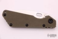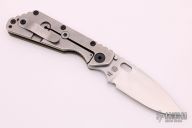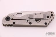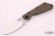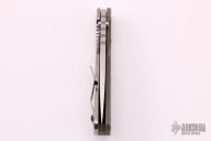 This SMF from Strider Knives features a stonewashed blade and textured green G10 and stonewashed titanium handle and matching tip up titanium clip. Notches on thumbrest, rear of handle, and lockup. Includes Hinderer "Lock Bar Stabilizer" for maximum reverse lock retention. Has a few light scratches, otherwise excellent condition.