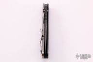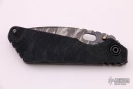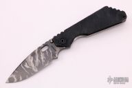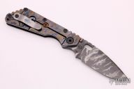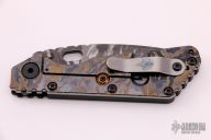 This SMF by Mick Strider features a laser engraved blade with thumbhole and notched thumbrest. The handle has laser engraved black aluminum and titanium frame and tip up titanium clip, has black hardware and an anodized titanium lockbar stabilizer. Notches on thumbrest, rear of handle. Nice detent, blade seating and lockup. New condition.
