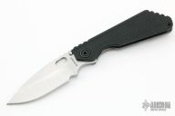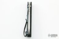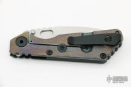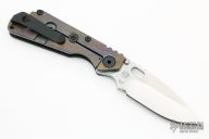 This SNG framelock folder by Mick Strider features a stonewashed blade and a dimple pattern black aluminum and anodized bark titanium frame and tip up titanium clip. Includes a "Lock Bar Stabilizer" for maximum reverse lock retention. Black deep carry clip. Nice detent, lockup and blade seating. Excellent condition.