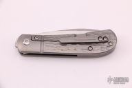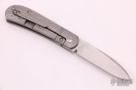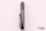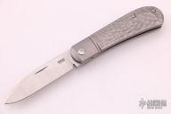 This Trapper Front Flipper by Enrique Pena features a satin finished blade with a front flipper and notched thumbrest. The handle is composed of jigged titanium with a matching backspacer and tip up pocket clip. Includes a Pena X-Series padded box. Has a couple light scratches, otherwise Excellent Condition.