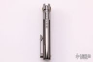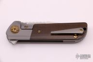 This Lanny is a Liong Mah design executed by Reate Knives. It features a two tone clip point blade with notched thumb rest, fullers and flipper. The handle is comprised of titanium bolsters and micarta scales titanium liners and backspacer with matching tip up clip that is reversible for left or right hand carry. Anodized titanium hardware and lanyard hole in pommel. Includes padded/zippered case. Excellent condition.