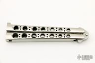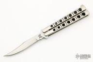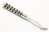 This Bowie balisong from Pacific Cutlery features a Jody Samson ground satin finished blade with a false top edge. The handles are stainless steel with hole pattern. Has some light scratches, otherwise good condition. Includes a nylon sheath. This knife is only stamped "USA" on the back side instead of "Balisong USA".