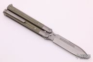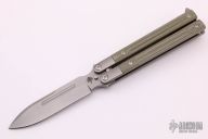 The SPD Invictus-Bali OD Green MIcarta is a utility butterfly knife, featuring titanium billet handles with canvas micarta scales, a Böhler M390 blade, bronze bushing pivot, and a titanium spring latch. Additional details include jimping on the ears and back spacers, and a billet titanium pocket clip. Comes with a zippered case. New condition.