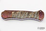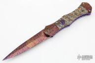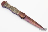 This Dart side opening automatic by Rainy Vallotton features a dagger ground Chad Nichols "Cheetah" Damascus blade with false top edge. The handle has matching Damascus bolsters, and button with Mammoth Molar covers, stainless steel fileworked backspacer and anodized titanium liners with filework. Nice action, lockup and blade seating. Comes with padded zippered case and COA. Excellent condition.