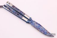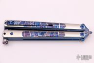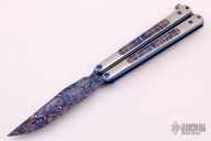 This Model 2 Balisong by Les Voorhies features a blued Eggerling Mosaic Damascus blade. The handles have polished titanium scales with matching Damascus inlays, anodized titanium liners, tip up matching Damascus clip. Comes with original box and COA dated 6-24-19. Rides on IKBS. Excellent condition.