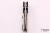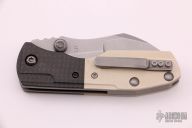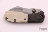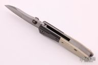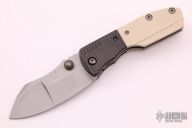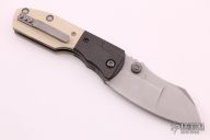 This custom Omega folder by Kingdom Armory features an acid tumbled multi-ground blade with notched thumbrest and dual thumbstuds. The handle has carbon fiber bolsters, ivory paper micarta scales, tumbled titanium liners, backspacer, and tip up clip. Includes a hard case. Nice detent, lockup and blade seating. Excellent condition.