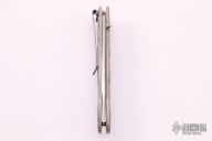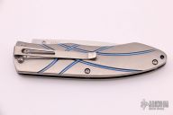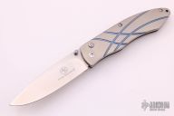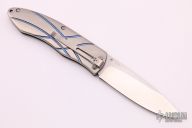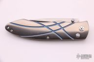 This button lock folder by Arno Bernard has a satin finished blade and a sleek brushed titanium handle with a blue anodized milled pattern. Both the thumbstud and the release button have a blue gemstone inset. Tip down carry clip. Very smooth action with nice lockup and blade seating. Has a few light scratches, otherwise excellent condition. Comes with a zippered case.