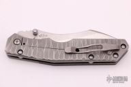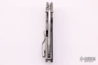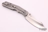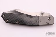 This Custom Super Samaritan by Kingdom Armory features a satin finish clip point blade with swedge, dual thumbstuds and notched thumbrest. The handle is comprised of bead blasted titanium bolster and carbon fiber scale over bead blasted titanium liner and textured lockside, tip up titanium clip. Comes with a hard case. #1 of the first 10. Has a few light scuffs, otherwise excellent condition. Nice detent, lockup and blade seating.