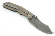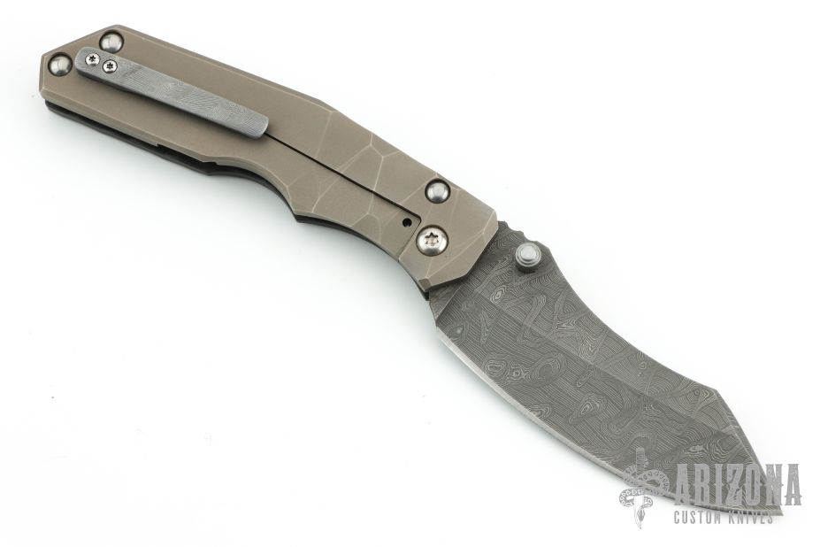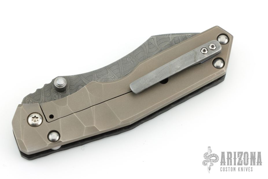 This Large Samaritan folder by Kingdom Armory features a Damascus blade with dual thumbstuds and notched thumbrest. The handle has a sculpted carbon fiber scale, anodized titanium frame, tip up Damascus clip. Blade is centered when closed, smooth action, and solid lockup and detent. Has a few light scuffs, otherwise excellent condition. Comes with a zippered case.