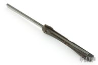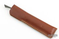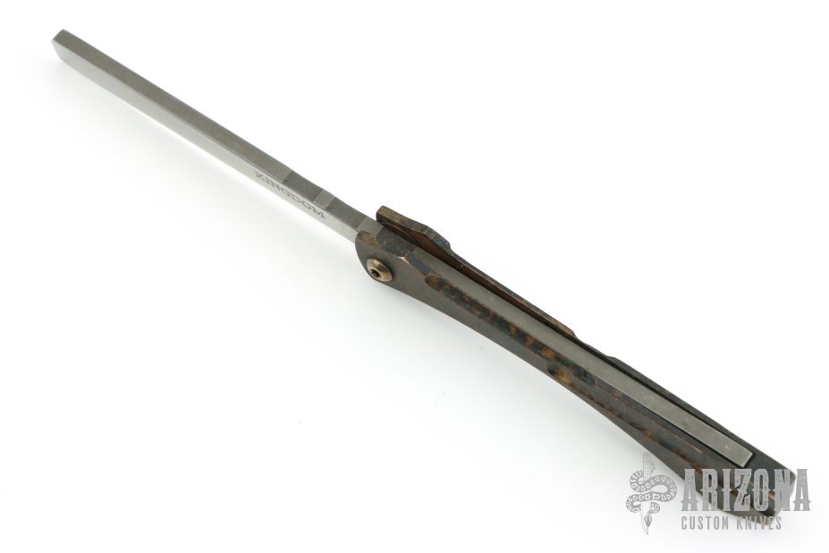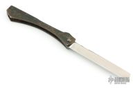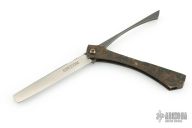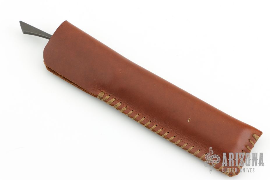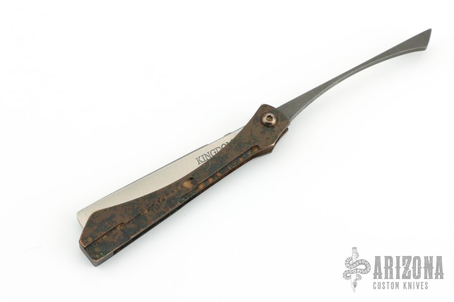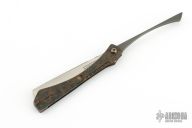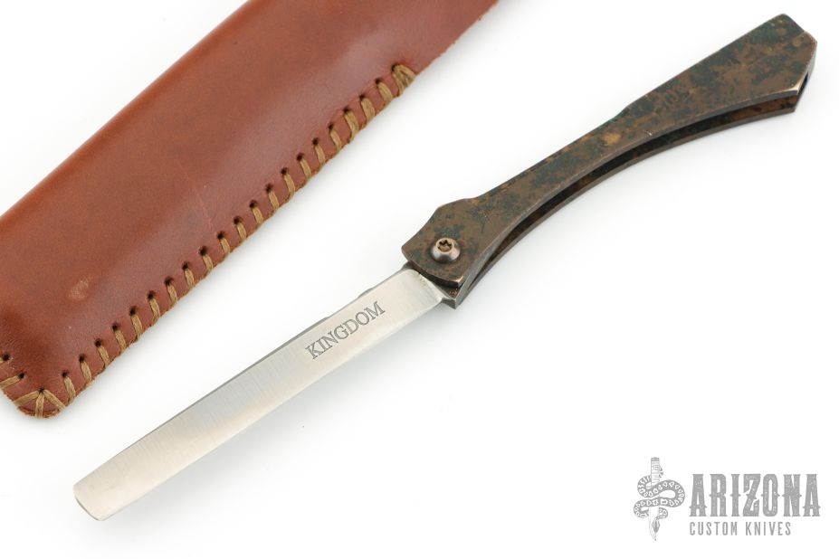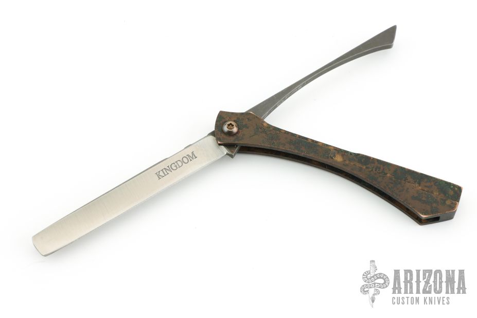 Kingdom Armory's David Rydbom says he's been on something of an old school razor kick. Fire up that "Stuck in the Middle with You" song and get ready to get all Michael Madsen! David's razor series is a long tang style razor. Most straight razors are not designed to be used fully open, but rather at an angle. Due to the design of the tang, this model works well fully opened and doubles as a friction folder. The blade is double hollow ground, satin finished. The patinated copper frame is contoured and has a matching backspacer pinned with brass pins. Comes with a leather sheath. Excellent condition.
