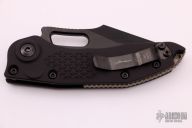 This Signature Series Stitch Auto by Microtech Knives features a partially serrated DLC tumble finished blade and false top edge, notched thumb and finger rests. The handle has a black anodized and milled aluminum handle with a bronzed titanium backspacer, DLC stainless steel hardware and clip, tip up carry, lanyard hole at the butt. Comes with original box and papers. S/N of 289 and dated 09/2021. Excellent condition.