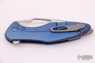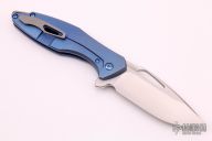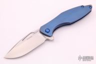 This Arius by Koenig knives features a two-tone blade with thumbhole and flipper. The handle has a nicely milled and anodized titanium frame with anodized titanium hardware and a tumbled tip up clip and backspacer. Has ceramic bearings and a ceramic detent ball. Nice detent, lockup and blade seating. Comes with original box and COA dated July 7th, 2021. Excellent condition.