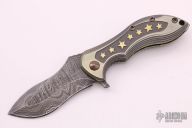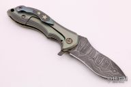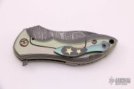 This Mini Skirmish Flipper by Neil Blackwood features a Todd Fischer Sr Damascus blade with notched thumbrest and a flipper. The handle has an anodized and milled titanium frame with matching tip up clip, anodized titanium backspacer. Nice detent, lockup and blade seating. Comes with a zippered case. Excellent condition.