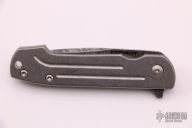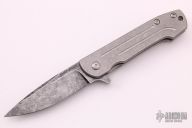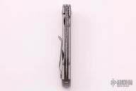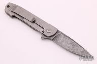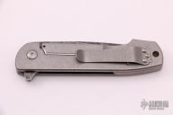 This Kumu by Defiant 7 features a dark tumble finished blade with flipper. The handle has a stonewashed titanium frame with matching backspacer and tip up clip. Rides on bearings, nice detent, lockup and blade seating. Comes with a zippered case. New from maker at the 2021 NYCKS.