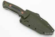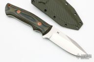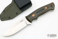 This Tomcat from Dan Crotts features a satin finished blade with a full tang construction. .095" blade stock and 1.152" blade depth. The handle features micarta scales and copper pins.  Includes kydex sheath with belt loop set up for horizontal carry. New from maker.