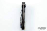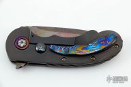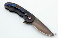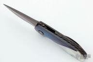 This Aurora Flipper by Alistair Bastian features a Mosaic Carbon Damascus blade with swedge, fileworked thumbrest and flipper. The handle is comprised of fluted black timascus bolsters and pivot collars and custom fileworked pivot, fluted mother of pearl scale with hidden screws, anodized titanium frame, fileworked stainless steel backspacer, timascus tip up clip with hidden screws. Includes maker's card dated 07/21 and padded hard shell case. Great blade seating, detent and lock up, rides on stainless caged bearings. Excellent condition. #246