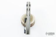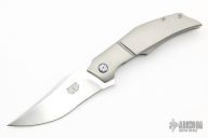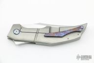 This Point Blank by Tashi Bharucha features a hand-rub RWL-34 recurve blade. The handle is orange peel finish titanium with titanium backspacer and hardware. Timascus pivot rings and clip positioned for tip up carry. Nice action, and blade seating. Includes a padded zippered case.  Excellent Condition.