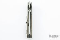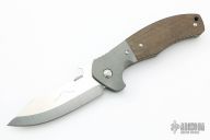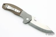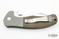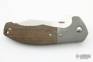 This Custom Combat Systems Fighter by Emerson Knives features a satin finished 154CM blade with notched thumbrest, knurled thumbdisc and wave feature. The handle has dovetailed bead blasted titanium bolsters and liners, green canvas micarta scales, black G-10 backspacer and tip up stainless steel clip, tip up carry. Comes with original box and papers. Excellent condition.