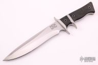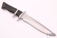 This Model 2 Sub-Hilt by Walter Brend features a double hollow ground blade with hand-rubbed satin finish, and a 4" sharpened top edge, .249" blade stock and 1.648" blade depth, full tang construction. The handle has a satin finished titanium double guard and sub-hilt, and black canvas micarta scales, hollow tube pins and lanyard hole. This knife is beautiful and sports the "Walterboro, SC" logo. Comes with a zippered case. Excellent condition.
