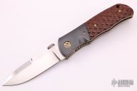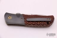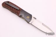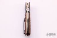 This SD-2 liner lock folder by John W Smith features a hand rubbed satin finish blade with thumbdisc. The handle has dovetailed zirconium bolsters and tip up pocket clip, checkered wood scales and backspacer, anodized titanium liners with jeweled interiors. Perfect function. Strong lock up, nice detent and blade seating is dead center. Includes a padded zippered case. Excellent condition.
