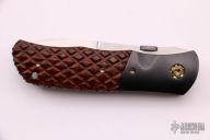 "I have been a fulltime maker since 1993 and am proud to be a voting member of the Knifemakers Guild. Most of my work is in embellished locking folders, with an occasional art fixed blade. In 1994 I began doing my own engraving and started making Damascus in 1999. I prefer natural handle materials such as mother of pearl, fossil Ivories and stone. Blade steel is my Damascus (unless otherwise noted) or one of the high quality stainless steels currently available. The embellishments I offer are engraving, gold inlay, mosaic pearl inlays, file work, carving and solid 14K gold screws and thumb studs that I make in shop."