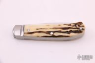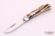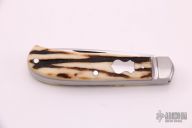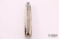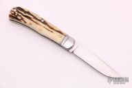 This Slipjoint by Brett Dowell features a hand rub satin finished blade with nail nick. The handle has fluted stainless steel bolsters, stag covers with stainless steel escutcheon, stainless steel liners and spring. Has half-stop, flush in all positions. Comes with a zippered case. Excellent condition.