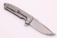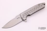 This VECP Flipper by Les George features a tumble finish CNC flat ground blade and a milled and tumble finished titanium frame with matching tip up clip. Hinderer lock bar stabilizer. Phosphorus bronze washers. Smooth action. Excellent blade seating, detent and lockup. Includes zippered case and patch. New from maker at the 2021 NYCKS.