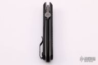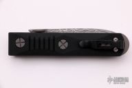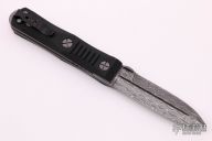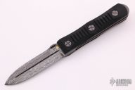 This EK Folder by Allen Elishewitz features a Stainless Damascus blade with fullers, false top edge and a thumbdisc. The handle has black G-10 scales patterned after an EK Knives dagger, bead blasted titanium liners, tip up black stainless steel clip, black G-10 backspacer. Rides on bearings, nice detent, lockup and blade seating. Comes with velcro case and COA. New from maker at the 2021 NYCKS.