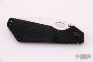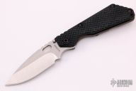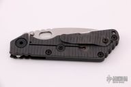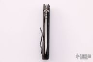 This SNG framelock folder by Mick Strider features a stonewashed blade and a dimple pattern black aluminum and flamed titanium frame and tip up titanium clip. Includes a "Lock Bar Stabilizer" for maximum reverse lock retention. Nice detent, lockup and blade seating. Excellent Condition.