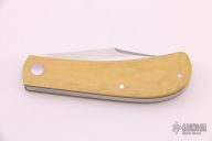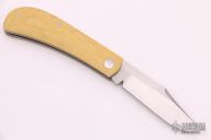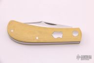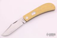 This Lanny's Clip by Enrique Pena features a satin finished blade with nail nick. The handle has yellow paper micarta covers over black G-10 liners, stainless steel escutcheon, liners and spring. Half-stop, flush in all positions. Comes with a leather case. Excellent condition.