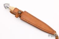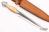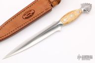 This dagger by Billy Mace Imel features a double edged hand rub satin finished blade, .577" blade stock and .995" blade depth, full integral with tapered tang. has walrus ivory inlays. Excellent grinds and finish work. Great feel in the hand. Comes with brown leather sheath and zippered case. Excellent condition.