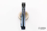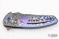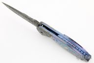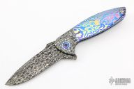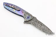 This Nitro linerlock flipper by Peter Carey features a Damascus blade with a false top edge, notched thumbrest and flipper. The handle has Damascus bolsters with mokuti pivot collars, mokuti scales, anodized and orange peel finished titanium liners, tip up mokuti pocket clip, mokuti backspacer, and anodized titanium hardware. Nice detent, lockup and blade seating. Comes with a zippered case. Excellent condition.
