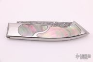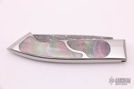 This Interframe Lockback by Charles Bennica features a Damascus blade. The handle has a mirror polished stainless steel frame with black lip pearl inlays with black liners, mirror polished stainless steel backspacer and butt which is the lock release. Nice lockup and blade seating. Excellent condition. Comes with a zippered case.