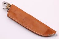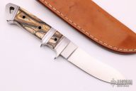 This stunning integral Sub-Hilt Skinner from Mr. Kressler features a hand rubbed, satin finished blade with checkered thumbrest. The handle features stabilized mammoth ivory scales with black liners, .175" blade stock and 1.070" blade depth, full tapered tang integral construction. Comes in a brown leather sheath with belt loop. New from maker.