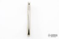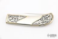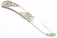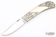 This lockback folder by Buster Warenski features a hand rub satin finished blade with a single nail nick. The handle has an engraved nickel silver frame with gold inlays, stainless steel backspacer with engraved lock relief. Has a few light scratches, otherwise excellent condition. Comes with leather pouch. Engraved by Julie Warenski.