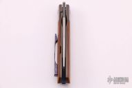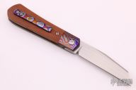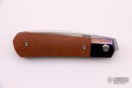 This Raptor Front Flipper by Enrique Pena features a hand rub satin finished wharncliffe blade with swedge, notched thumbrest and front flipper. The handle has zircuti bolsters, natural canvas micarta scales, anodized titanium liners, tip up zircuti clip, anodized titanium backspacer. Includes padded and zippered case. New from maker.