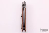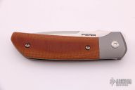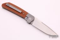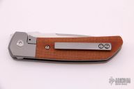 This Mula Front Flipper by Enrique Pena features a hand rub satin finished drop point blade with swedge, notched thumbrest and front flipper. The handle has a blasted titanium frame with natural canvas micarta inlays, and a tip up titanium clip. Nice detent, lockup and blade seating. Comes with zippered case. New from maker.