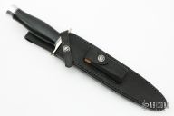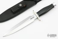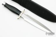 The Model 2-8 by Randall Made Knives is a heavily made dagger or dirk. Nickel silver guard, black linen micarta grip, duralumin butt cap, black/duralumin spacers. Double-edged satin finished blade, .203" blade stock and 1.381" blade depth, hidden tang construction. Comes with a black leather sheath and original paper wrapping. New from maker.