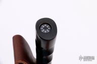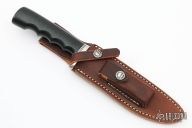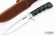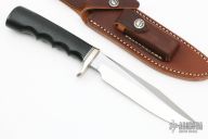 This Model 5 Camp and Trail Knife by Randall Made Knives features a satin finished blade with false top edge and notched thumbrest, .200" blade stock and 1.158" blade depth, hidden tang construction. The handle has a nickel silver single guard and a black linen micarta grip with black and duralumin spacers and a compass in the butt. Comes with a brown leather sheath with belt loop and original paper wrapping. New from maker.