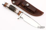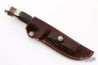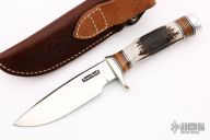 The Model 25-5 by Randall Made Knives is a drop point hunter similar to Model 11, but handle construction is reminiscent of 1930′s design. Excellent skinning, outdoors knife. This knife has a satin finished blade with notched thumbrest, .200" blade stock and 1.287" blade depth, hidden tang construction. The handle nickel guard and duralumin pommel, stag grip with stacked leather, black and duralumin spacers. Comes with brown leather sheath. New from maker. Comes with original paper wrapping.