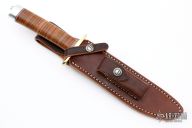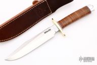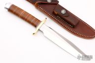 This Model 1-7 from Randall Made Knives features a satin finished clip point blade with sharpened top edge, .204" blade stock and 1.257" blade depth, hidden tang construction. The handle is comprised of a brass guard, red/white/blue spacers, stacked leather handle and duralumin pommel. Comes with brown leather sheath and original paper wrapping. New from maker.