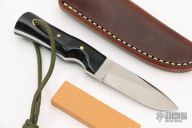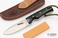 This Model 10 Salt Fisherman and Household Utility features a satin finish blade with notched thumbrest. 0.140" blade stock and 0.938" blade depth. The handle is comprised of black linen micarta scales over full tang construction. Brass lanyard tube with lanyard in pommel. Includes a brown leather sheath, sharpening stone. New condition.