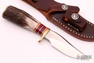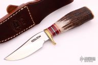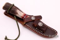 The miniature Model 27 debuted in Randall's 2012 75th anniversary catalog and is the first catalog miniature model. This knife has a 3.5" stainless steel blade, .169" blade stock and 1.012" blade depth, hidden tang construction. The handle has a brass guard and butt plate, and a stag handle with red, brass, white, red linen micarta, black and aluminum spacers. Comes with a brown leather sheath with miniature stone, original papers and a zippered case. New condition.