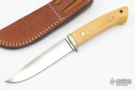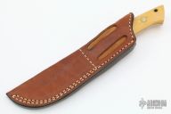 This 5" Utility Hunter by Jimmy Lile's has a satin finished 5" blade with .188" blade thickness and 1.020" blade depth, full tapered tang, 9.5" overall. The handle has a brass guard, yellow paper micarta scales with red liners/spacer, brass pins and lanyard hole. Comes with a brown leather sheath. Excellent condition.